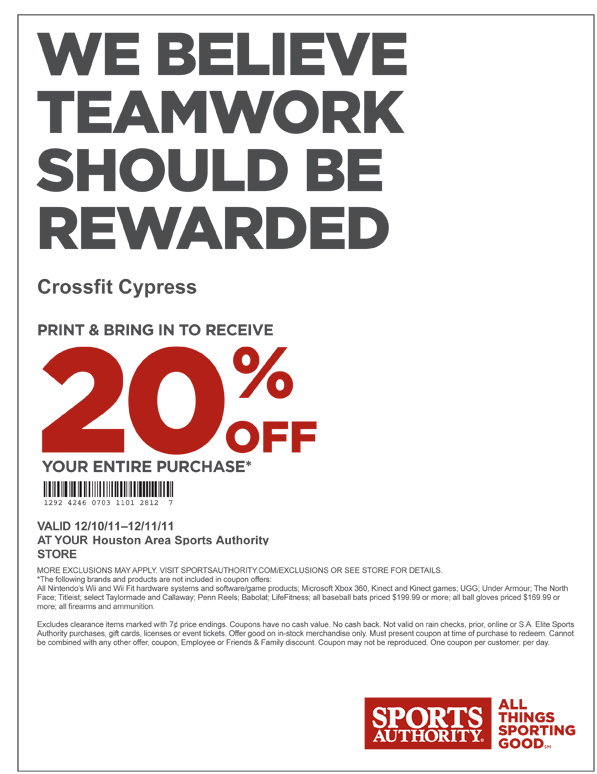 Print off the coupon at this link for your 20% off entire purchase at any Sports Authority